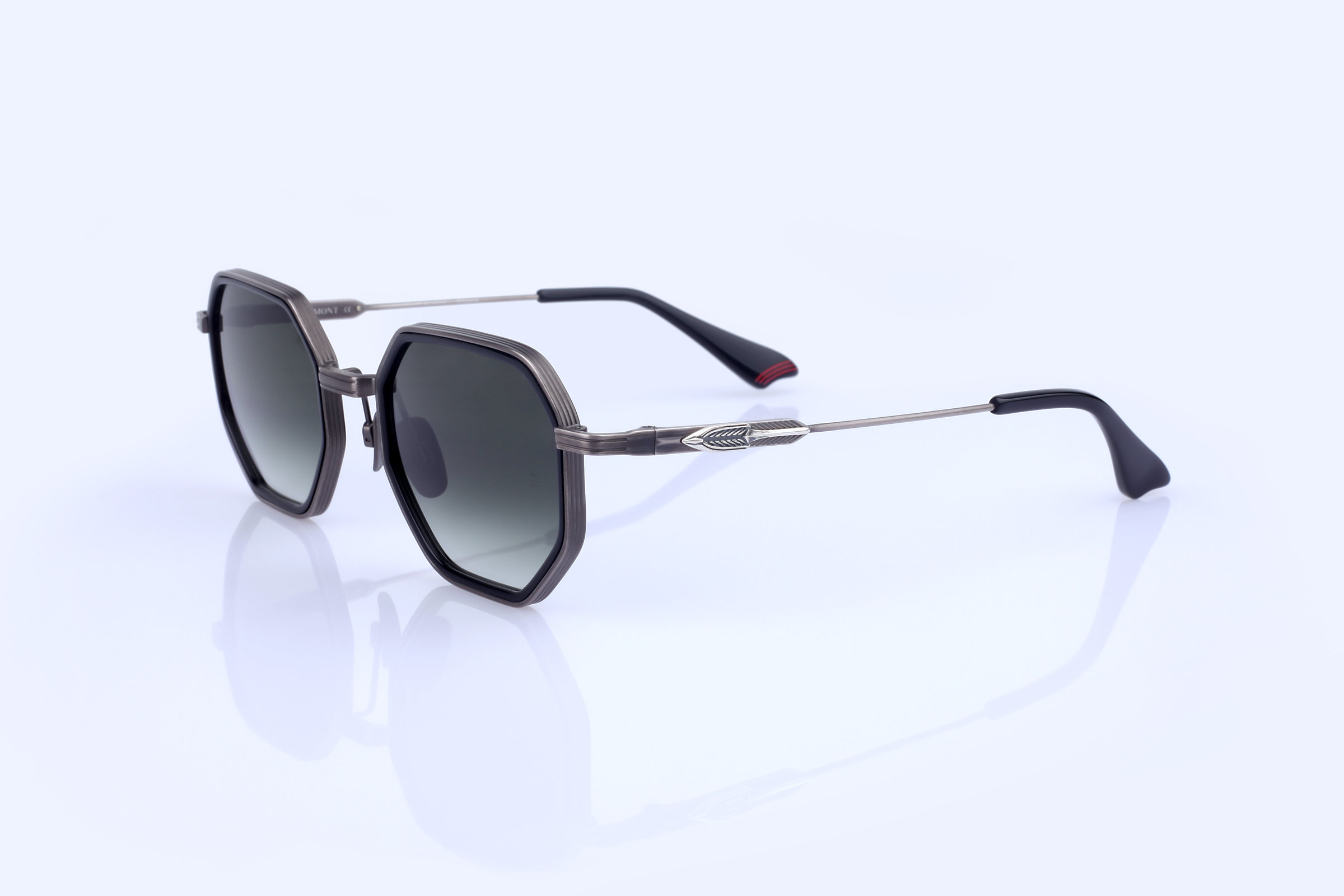 The Kadena - Gunmetal eyepiece blends retro charm with modern sophistication through its octagonal double-rimmed frame, featuring an inner acetate rim encased in a sleek metal outer rim. Aviation-inspired temples showcase corrugated patterns, nodding to the iconic Blackbird’s wing design, while black acetate tips with bold red accents reflect Esmont’s signature colour. A sterling silver ornament completes this elegant, vintage-inspired design.