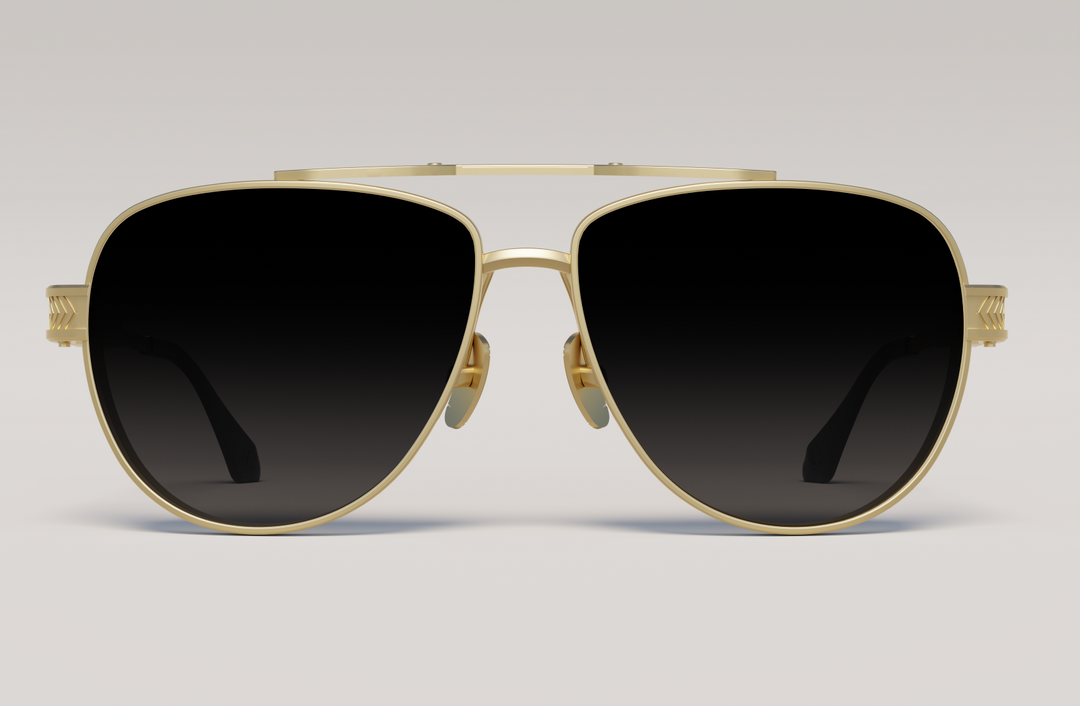 The Buzz - Luster Gold eyepiece is inspired by the historic Apollo 11 mission, featuring classic aviator silhouette and sleek lines that embody the spirit of space exploration. Adorned with intricate 18 carat gold-plated ornaments, it reflects the legacy of Buzz Aldrin, showcasing a design that captures the courage and innovation of humanity’s journey to the moon. An elegant tribute to adventure and ambition.