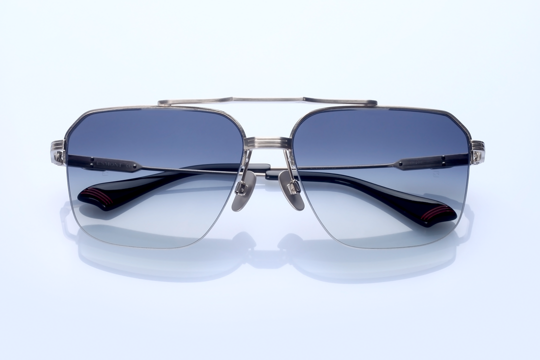 Sled - Palladium eyepiece merges aviation heritage with luxury craftsmanship. This sophisticated square aviator features a distinctive half-rim design and classic Esmont brow bar, adorned with .925 sterling silver ornaments that echo the SR-71 Blackbird's corrugated wings. The temples culminate in signature black acetate tips with red accents, honouring both aircraft and brand heritage.