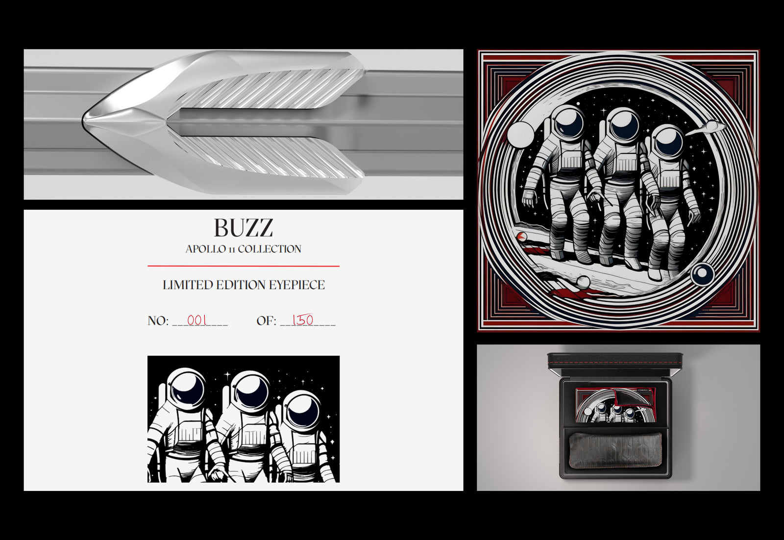 The Buzz - Black Gold eyepiece is inspired by the historic Apollo 11 mission, featuring classic aviator silhouette and sleek lines that embody the spirit of space exploration. Adorned with intricate 18 carat gold-plated ornaments, it reflects the legacy of Buzz Aldrin, showcasing a design that captures the courage and innovation of humanity’s journey to the moon. An elegant tribute to adventure and ambition.