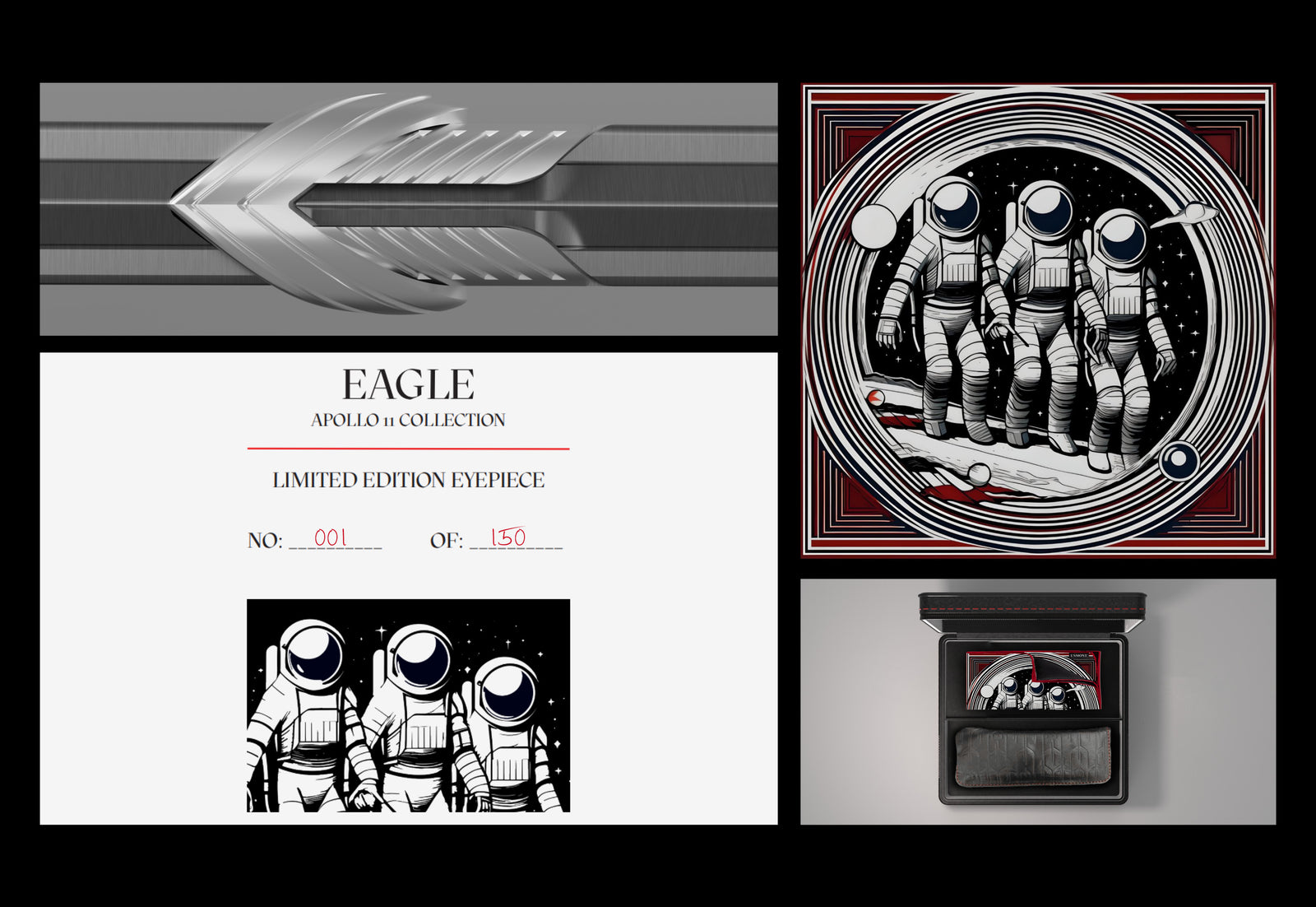 The Eagle - Black Gold eyepiece, inspired by the Apollo 11 Lunar Module, showcases a distinctive rectangular design that echoes the module's precision and innovation. Handcrafted in Japan, it combines robust titanium with eco-conscious acetate. Sterling silver ornaments add elegance, while its limited-edition status and exclusive packaging make it a collector’s masterpiece, celebrating the ingenuity and spirit of space exploration.