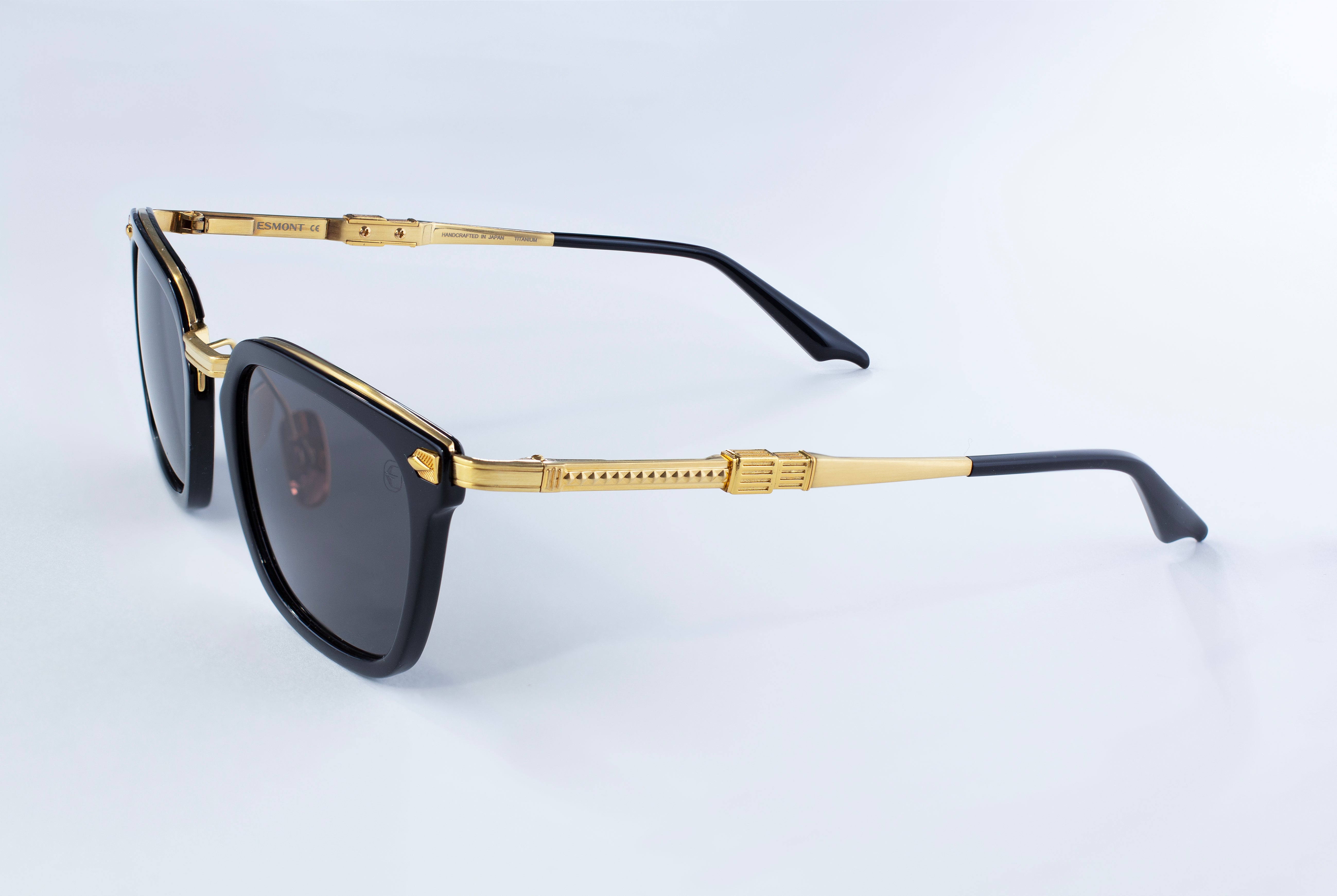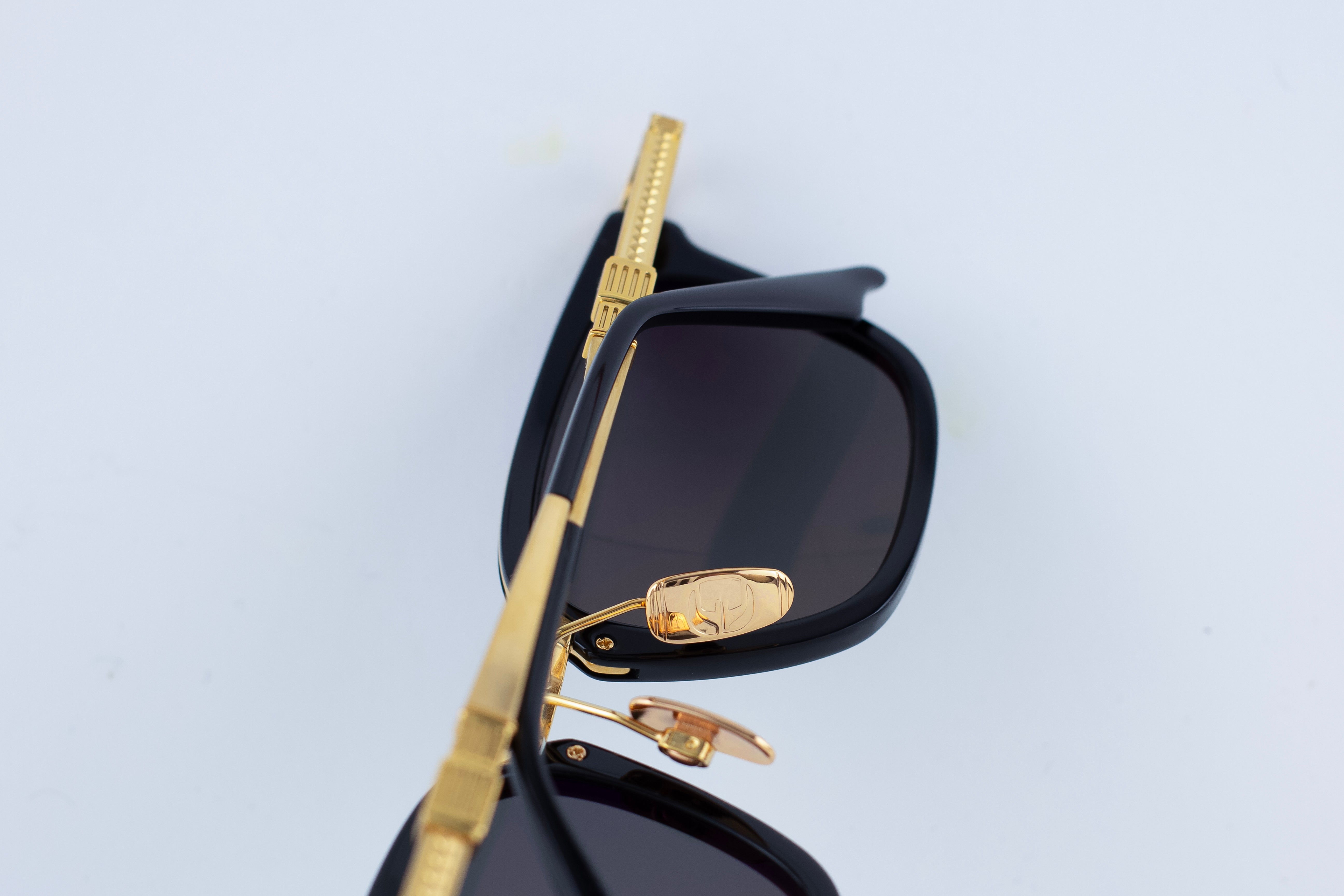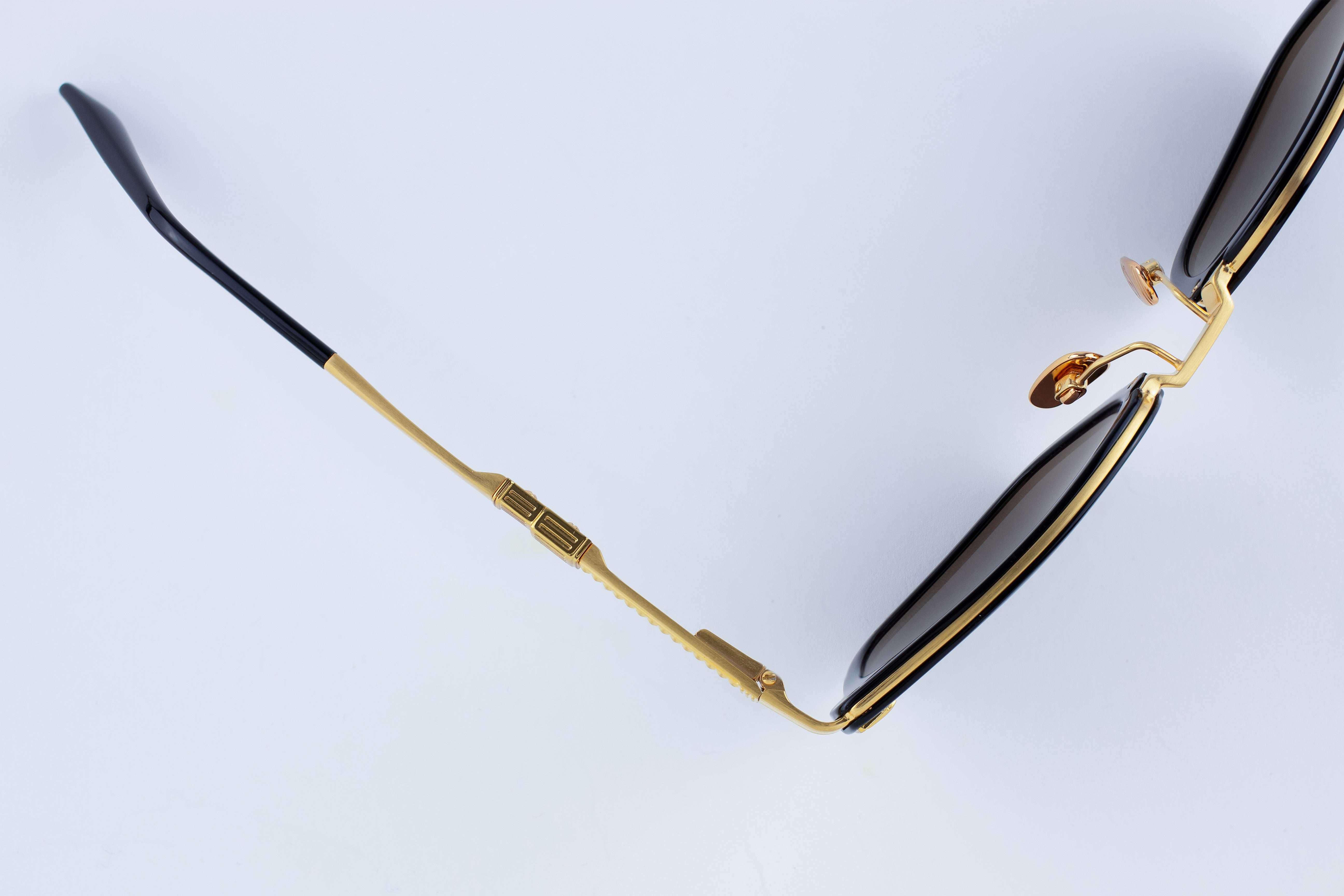 The Apollo 1 eyepiece features a blend of titanium, Japanese acetate, and 2 micron gold-plated ornament, symbolizing courage and innovation, reflecting the spirit of space exploration and timeless craftsmanship.
