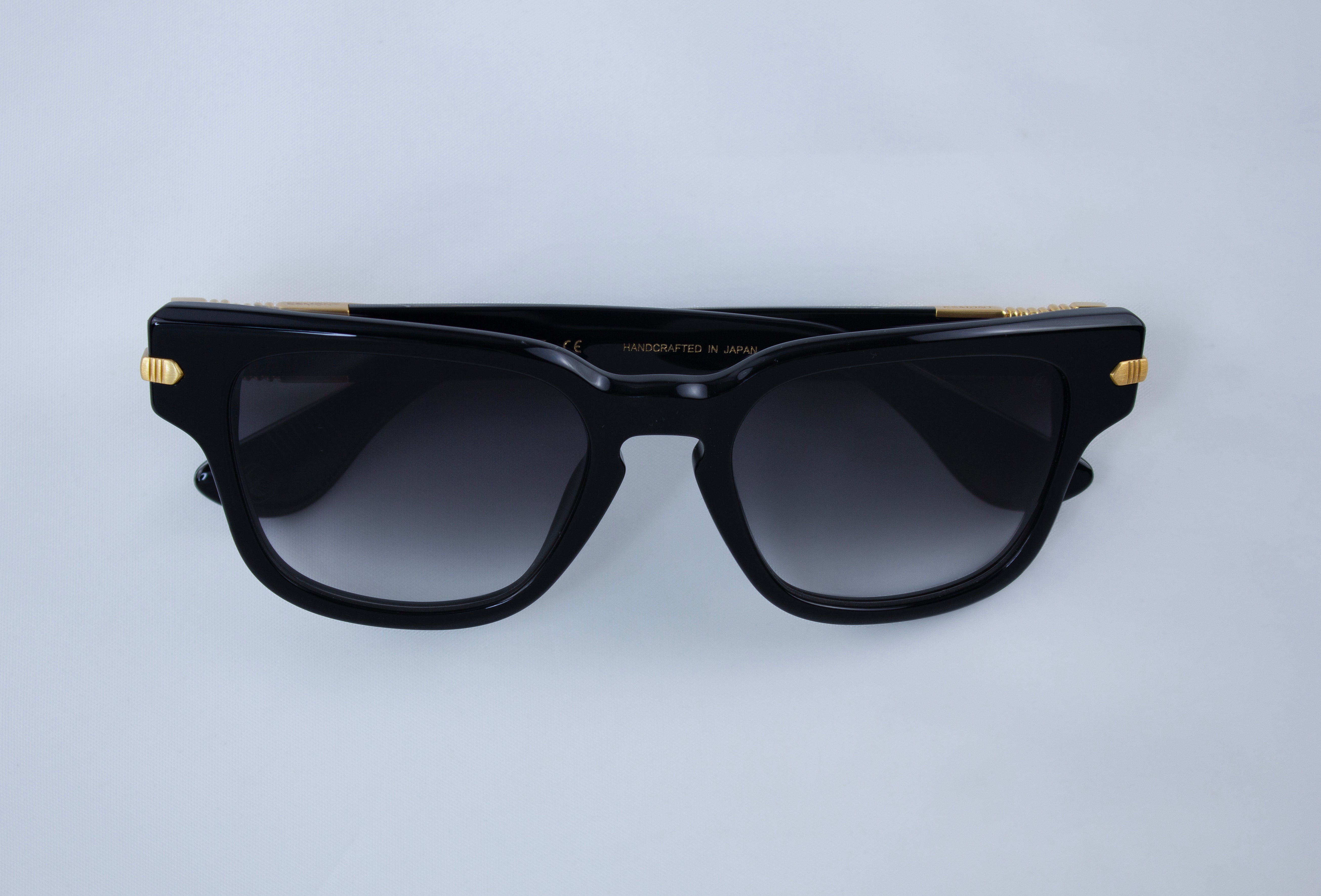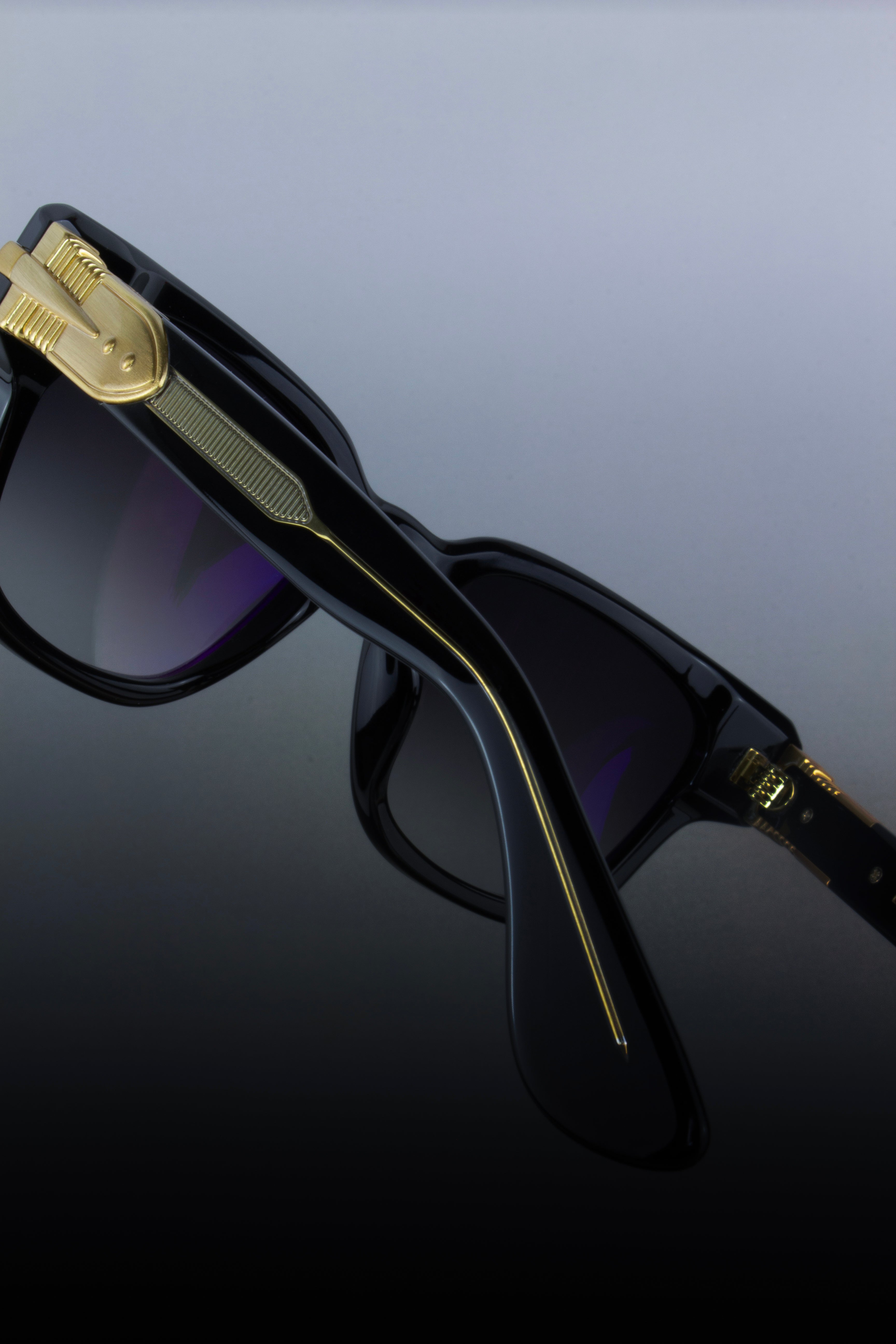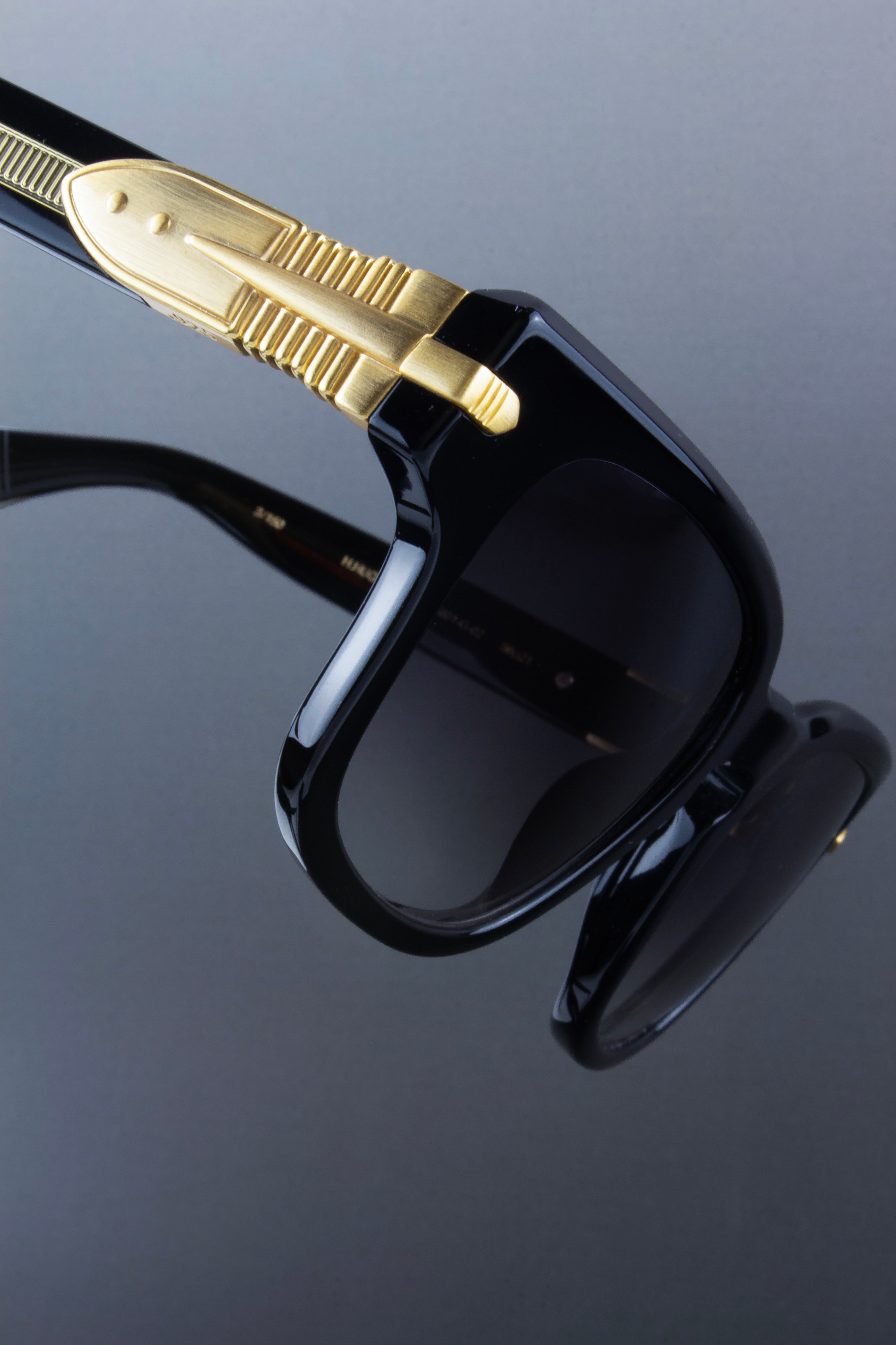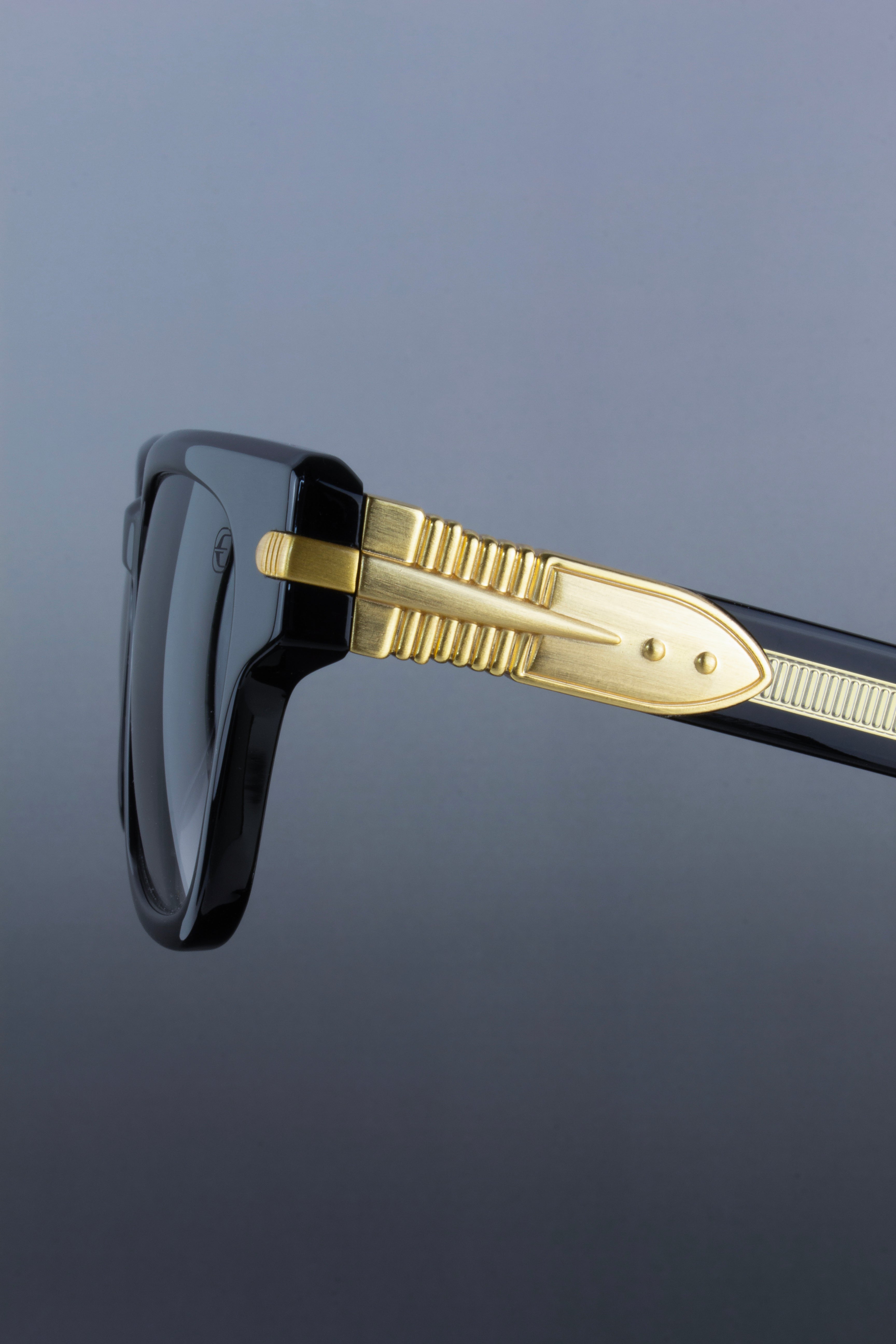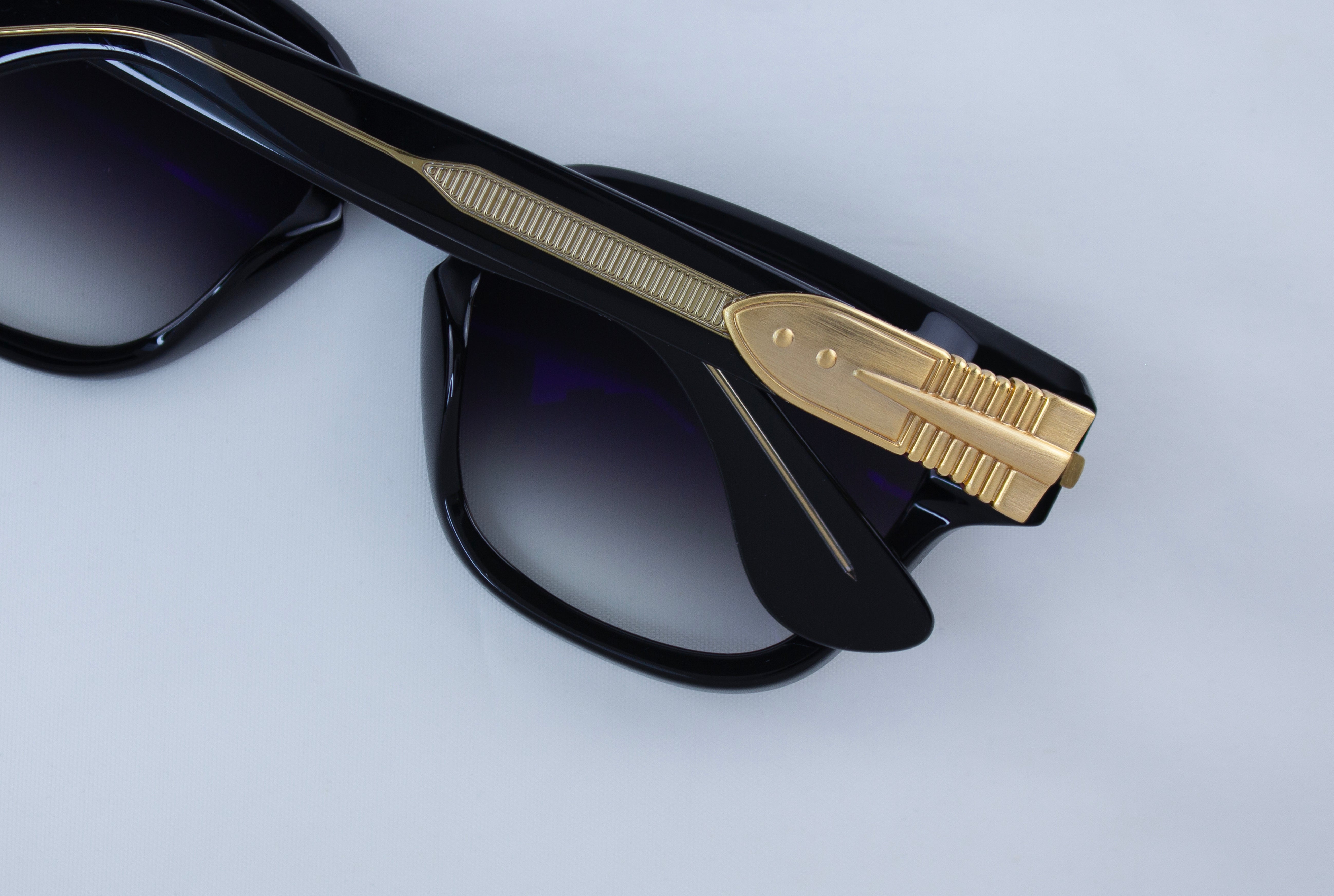 An exclusive eyepiece honouring Howard Hughes, combining robust titanium, elegant acetate, and 2 microns gold-plated ornament, reflecting innovation and adventure in every detail.